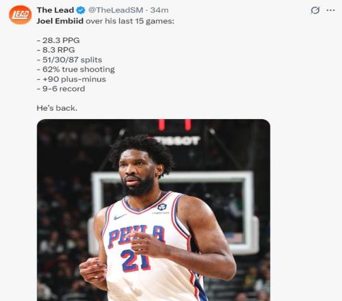 過去的15場比賽,恩比德場均28.3分8.3籃板,命中率51%,三分命中率30%,罰球命中率87%,真實命中率62%,正負值+90,戰績是9勝6負,美媒評價他重返巔峰了。