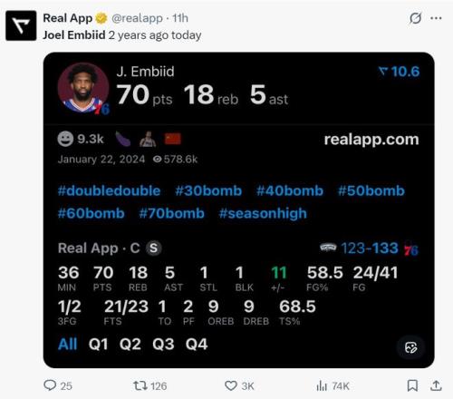 實際上在兩年前的今天,恩比德單場36分鐘拿到70分18籃板5助攻1搶斷1蓋帽幫助費城擊敗馬刺,兩年過去了恩比德終于再度回到巔峰?