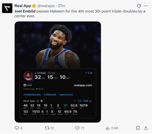 3.恩比德第六次30+三雙超過奧拉朱旺升至歷史中鋒位置第四;